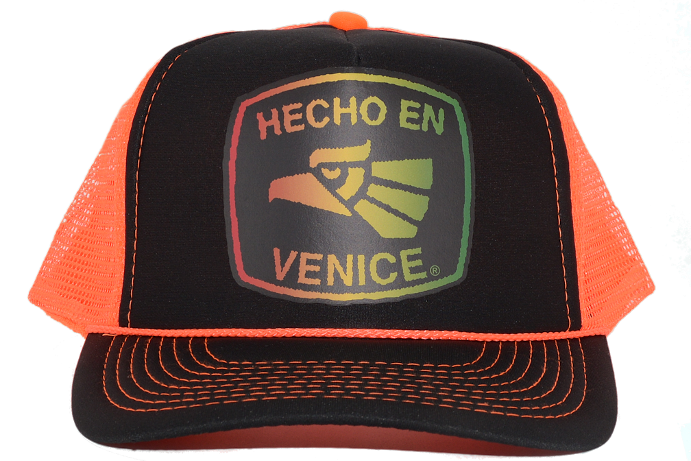 The classic Hecho En Venice snapback trucker hat with the Rasta colored logo, now in neon two-tone colors. Blue, Pink, Green, or Orange.