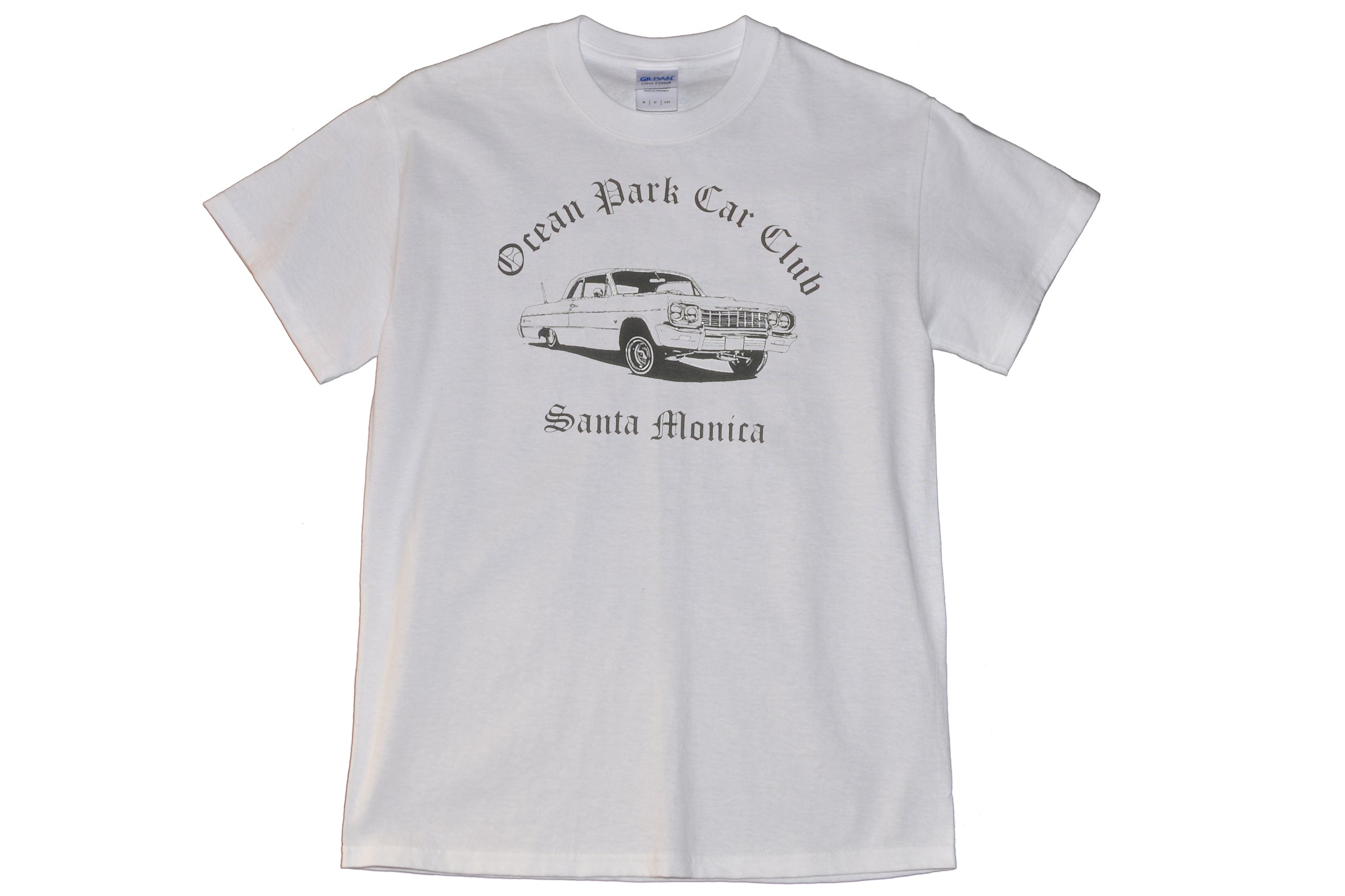 The Ocean Park Santa Monica Car Club t-shirt features a classic Impala on the front. This t-shirt is available in black, navy, light yellow, grey, light blue, and white.